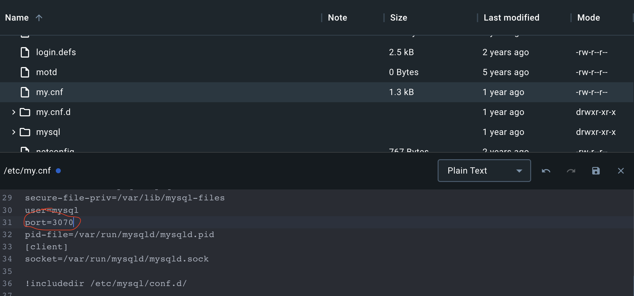 docker 데스크탑에서 각각의 컨테이너를 클릭한 후 file을 누르고 /etc/my.cnt 파일에서 각 컨테이너에 맞는 포트번호로 추가한다.